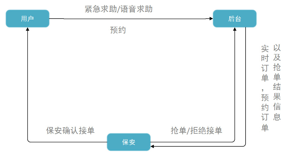 用户发布实时订单→系统筛选符合保安→保安抢单→系统按规则分配订单→保安抢到订单→联系用户开始订单